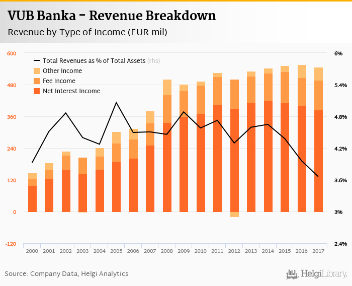 Comparing VUB Banka with its closest peers, Prima Banka Slovakia generated total revenues of 2.11% of assets in 2017, Slovenska Sporitelna operated with 3.48% revenue margin and Tatra banka produced total income worth 3.40% of assets.