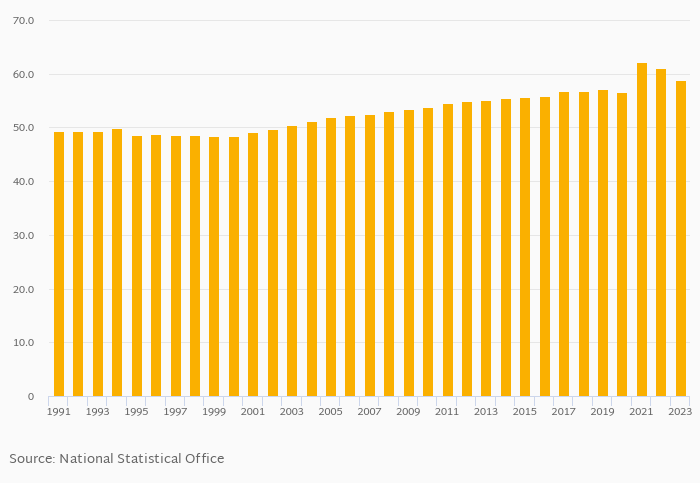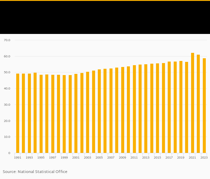 Waged and Salaried Workers, Total (As % of Total Employed) fell 3.72% to 58.7% in Rwanda in 2023, according to .