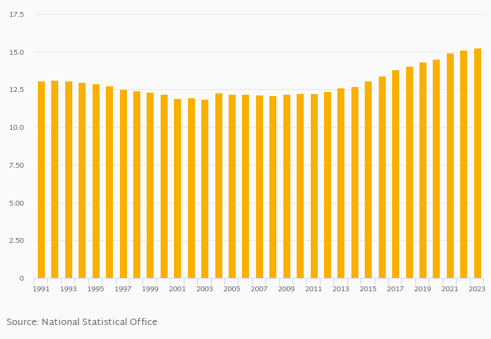 Waged and Salaried Workers, Total (As % of Total Employed) rose 0.646% to 15.2% in Burundi in 2023, according to .