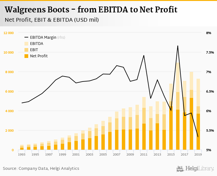 Walgreens Boots made a net profit of USD 3,703 mil with revenues of USD 137,412 mil in 2019, down by 30.5% and up by 2.1%, respectively, compared to the previous year. This translates into a net margin of 2.69%.