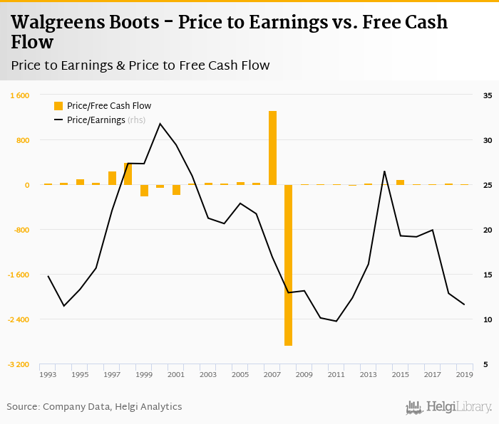 Regarding cash generated defined by the sum of net profit and depreciation, the stock traded at 9.07x at the end of 2019. When investments are excluded to get free cash flow, Walgreens Boots traded at 11.2x.