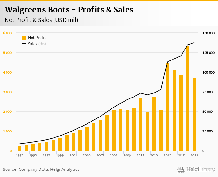 Walgreens Boots made a net profit of USD 3,703 mil in 2019, down 30.5% compared to the previous year. Total sales reached USD 137,412 mil, which is up 2.1% when compared to the previous year.