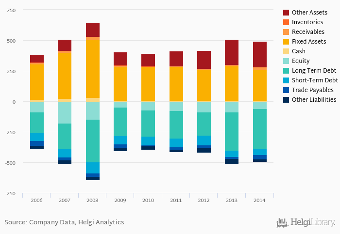 Net debt against equity is up 0.140 pp from five years ago (6.23). The ratio against EBITDA increased from -2.49x seen in 2009 to 27.5x.