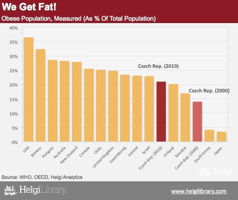 CZECHS GET FAT! The proportion of obese population has increased by half in the last decade, from 14% in 2000 to 21% at the end of 2010, according to the WHO. Although not as bad as in some other countries, the trend is highly worrying.