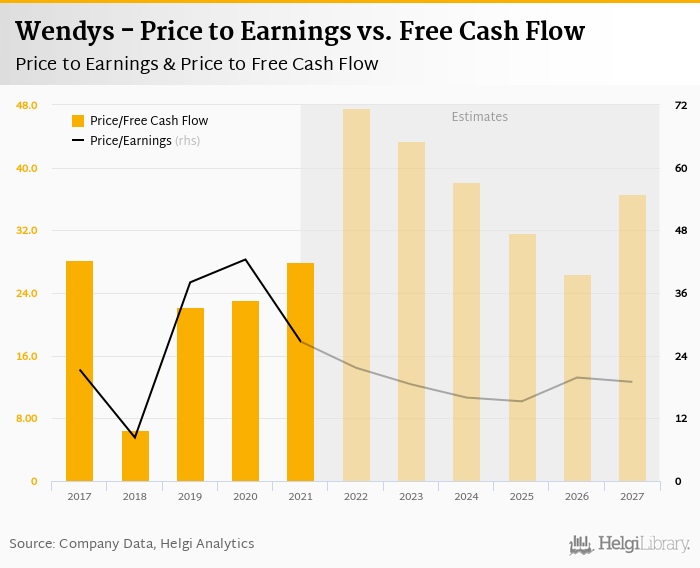 Regarding cash generated defined by the sum of net profit and depreciation, the stock traded at 19.9x at the end of 2021. When investments are excluded to get free cash flow, Wendys traded at 28.0x.