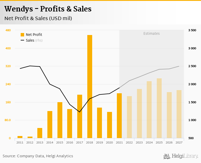 Wendys made a net profit of USD 200 mil in 2021, up 70.1% compared to the previous year. Total sales reached USD 1,897 mil, which is up 9.41% when compared to the previous year.