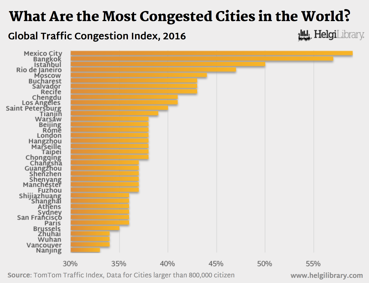 Using data from 2015, the TomTom Traffic Index looks at the traffic congestion situation in 295 cities in 38 countries on six continents – from Rome to Rio, Singapore to San Francisco.