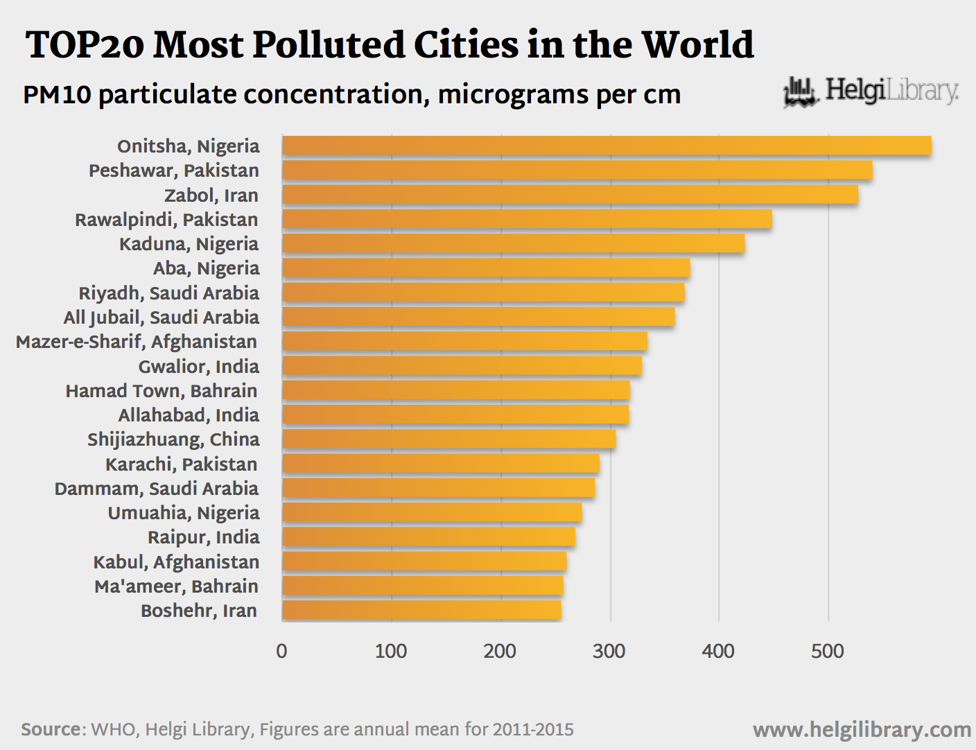 Of the 3,000 cities in the WHO’s air quality database, the most polluted at the time of measurement was Onitsha, a fast-growing city in Nigeria, which recorded roughly 30 times more than the WHO’s recommended levels of PM10 particles. Peshawar in Pakistan was in second place, followed by Zabol in Iran.