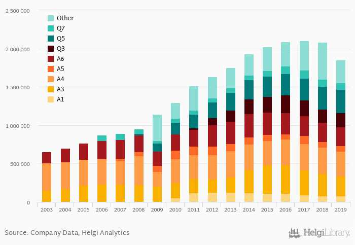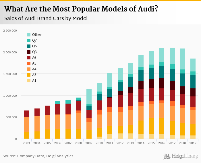 Models A4, Q5 and A3 were the most popular ones in 2019. Total of 327,467 of A4 models have been sold followed by 305,235 of Q5 and 253,639 of A3 that year.