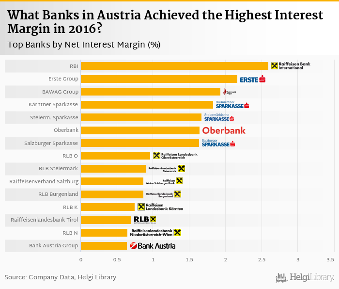 Based on a comparison of 17 banks in Austria in 2016, Raiffeisen Bank Int. operated with the highest net interest margin, followed by Erste Group Bank and BAWAG Group.
