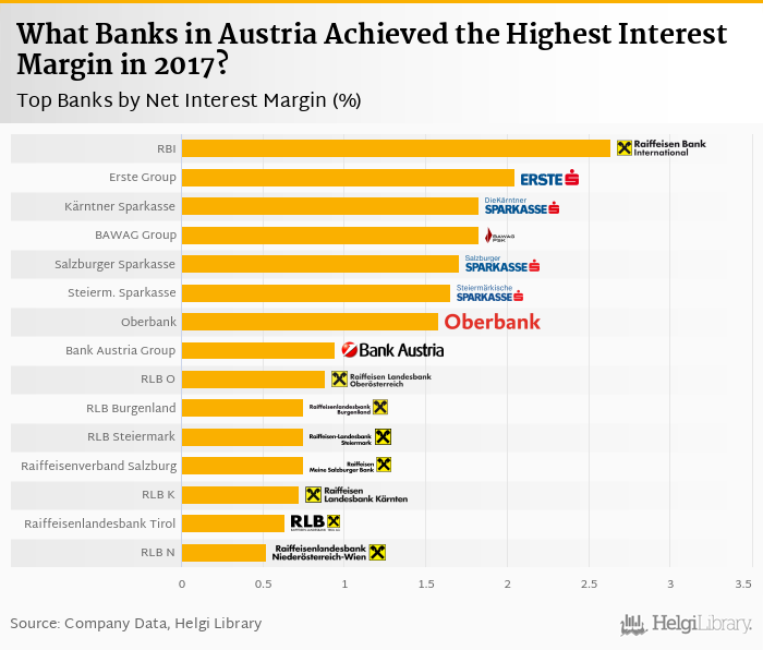 Based on a comparison of 17 banks in Austria in 2017, Raiffeisen Bank Int. operated with the highest net interest margin, followed by Erste Group Bank and Kärntner Sparkasse.