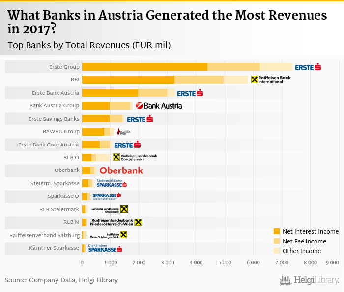 Based on a comparison of 20 banks in Austria in 2017, Erste Group Bank generated the largest revenues, followed by Raiffeisen Bank Int. and Erste Bank Austria.