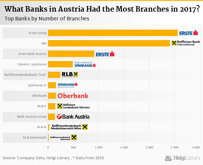 Based on a comparison of 12 banks in Austria in 2017, Erste Group Bank had the most branches, followed by Raiffeisen Bank Int. and Erste Bank Austria.