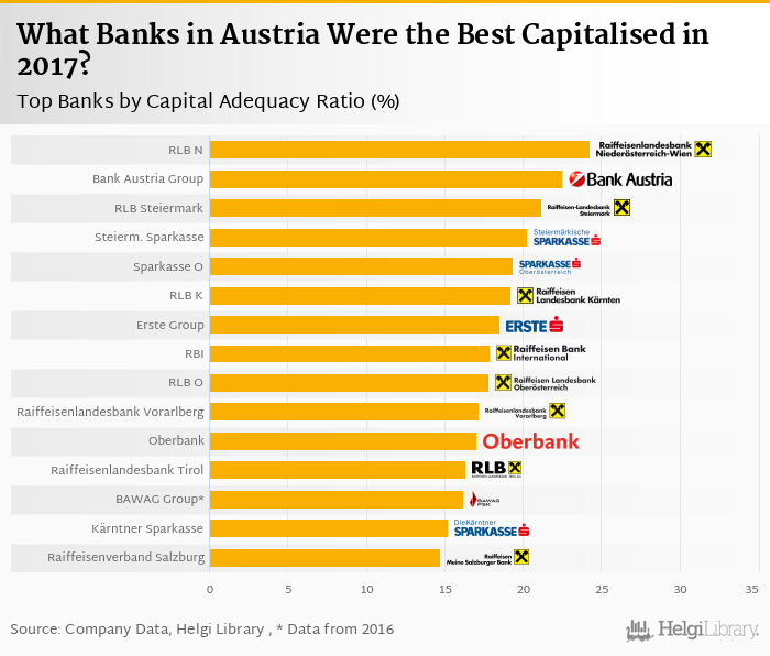 Based on a comparison of 16 banks in Austria in 2017, Raiffeisenlandesbank Niederosterreich-Wien was the best capitalised bank, followed by Bank Austria Group and Raiffeisenlandesbank Steiermark.