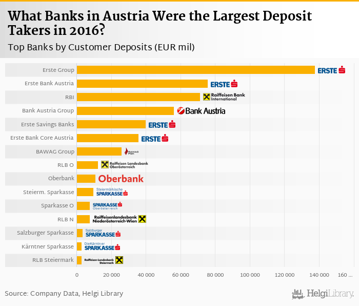 Based on a comparison of 20 banks in Austria in 2016, Erste Group Bank was the largest deposit taker, followed by Erste Bank Austria and Raiffeisen Bank Int..