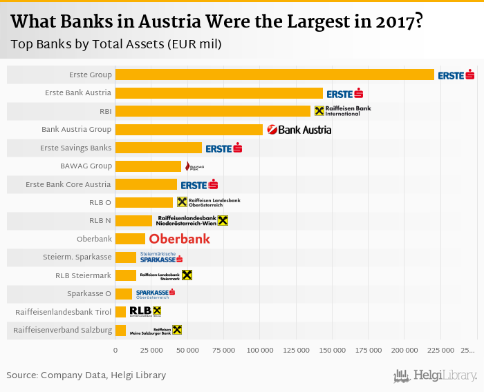 Based on a comparison of 20 banks in Austria in 2017, Erste Group Bank was the largest bank by assets, followed by Erste Bank Austria and Raiffeisen Bank Int..