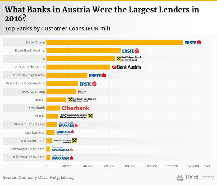 Based on a comparison of 20 banks in Austria in 2016, Erste Group Bank was the largest lender, followed by Erste Bank Austria and Raiffeisen Bank Int..