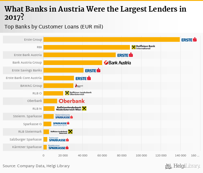 Based on a comparison of 20 banks in Austria in 2017, Erste Group Bank was the largest lender, followed by Raiffeisen Bank Int. and Erste Bank Austria.