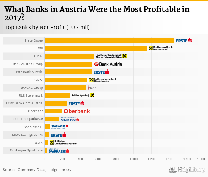 Based on a comparison of 20 banks in Austria, Erste Group Bank produced the highest net profit in 2017, followed by Raiffeisen Bank Int. and Raiffeisenlandesbank Niederosterreich-Wien.