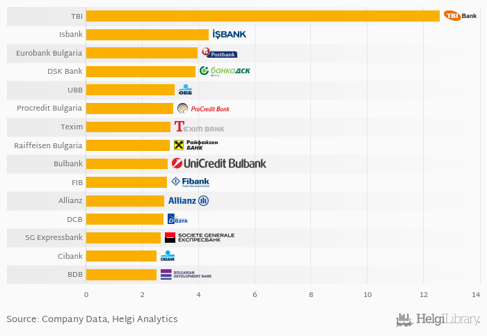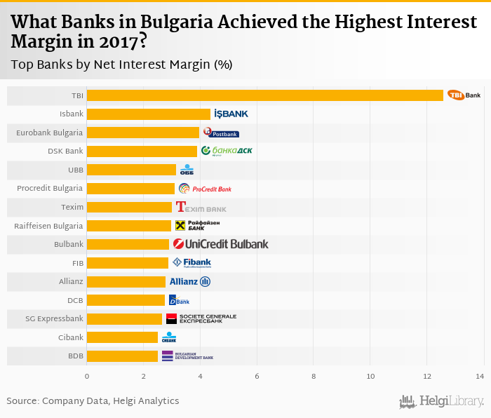 Based on a comparison of 28 banks in Bulgaria in 2017, TBI Bank operated with the highest net interest margin, followed by Isbank Bulgaria and Eurobank Bulgaria.