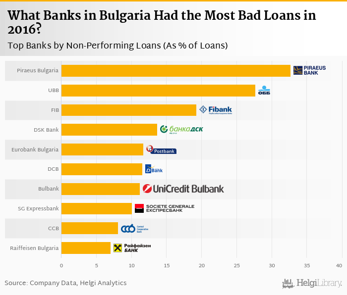 Based on a comparison of 11 banks in Bulgaria in 2016, Piraeus Bank Bulgaria had the highest share of bad loans, followed by United Bulgarian Bank and First Investment Bank.