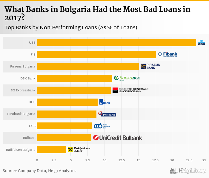 Based on a comparison of 11 banks in Bulgaria in 2017, United Bulgarian Bank had the highest share of bad loans, followed by First Investment Bank and Piraeus Bank Bulgaria.