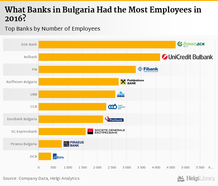 Based on a comparison of 11 banks in Bulgaria in 2016, DSK Bank had the most employees, followed by UniCredit Bulbank and First Investment Bank.
