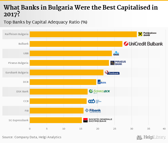 Based on a comparison of 11 banks in Bulgaria in 2017, Raiffeisenbank Bulgaria was the best capitalised bank, followed by UniCredit Bulbank and United Bulgarian Bank.