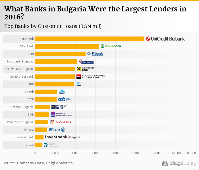 Based on a comparison of 28 banks in Bulgaria in 2016, UniCredit Bulbank was the largest lender, followed by DSK Bank and First Investment Bank.