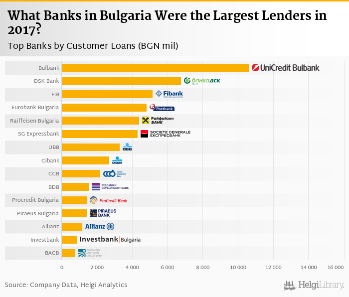Based on a comparison of 28 banks in Bulgaria in 2017, UniCredit Bulbank was the largest lender, followed by DSK Bank and First Investment Bank.