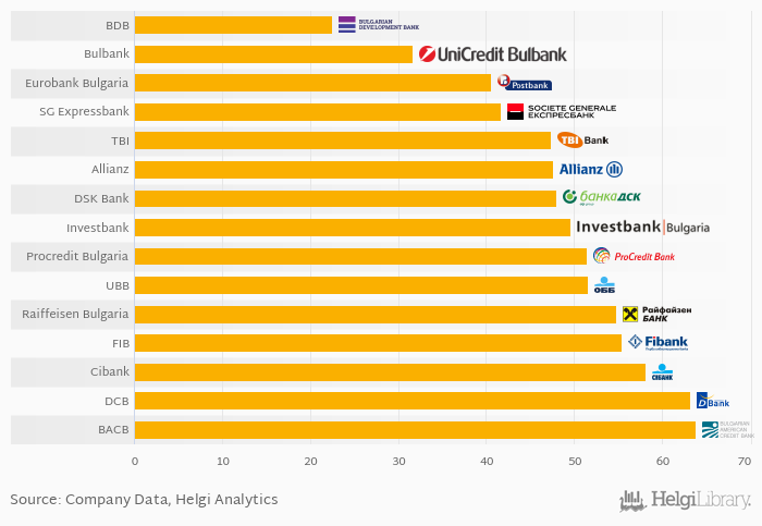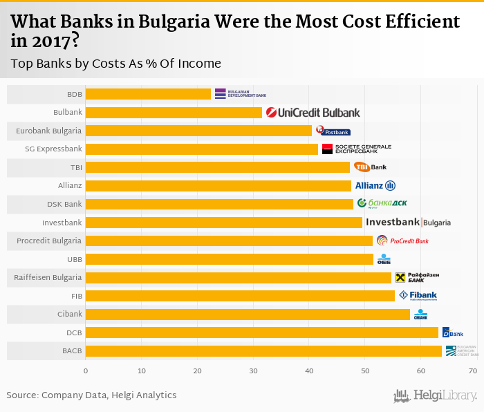 Based on a comparison of 28 banks in Bulgaria in 2017, Bulgarian Development Bank was the most cost efficient bank, followed by UniCredit Bulbank and Eurobank Bulgaria.