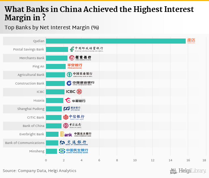 Based on a comparison of 14 banks in China in 2018, Qudian operated with the highest net interest margin, followed by Postal Savings Bank of China and China Merchants Bank.