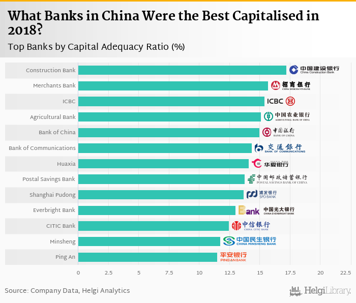 Based on a comparison of 13 banks in China in 2018, China Construction Bank was the best capitalised bank, followed by China Merchants Bank and Industrial & Commercial Bank of China.