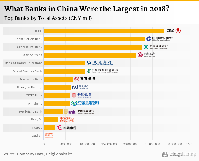 Based on a comparison of 14 banks in China in 2018, Industrial & Commercial Bank of China was the largest bank by assets, followed by China Construction Bank and Agricultural Bank of China.