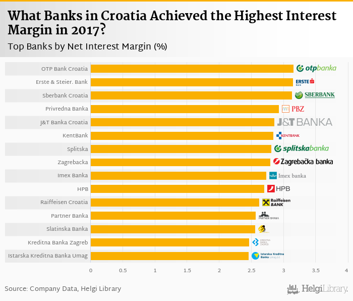 Based on a comparison of 23 banks in Croatia in 2017, OTP Bank Croatia operated with the highest net interest margin, followed by Erste & Steiermarkische Bank and Sberbank Croatia.