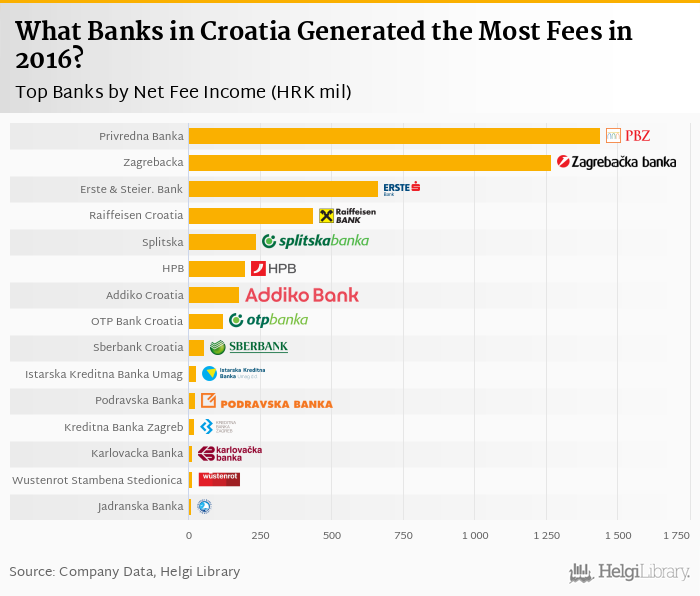 Based on a comparison of 23 banks in Croatia in 2016, Privredna Banka Zagreb generated the largest fee income, followed by Zagrebacka Banka and Erste & Steiermarkische Bank.