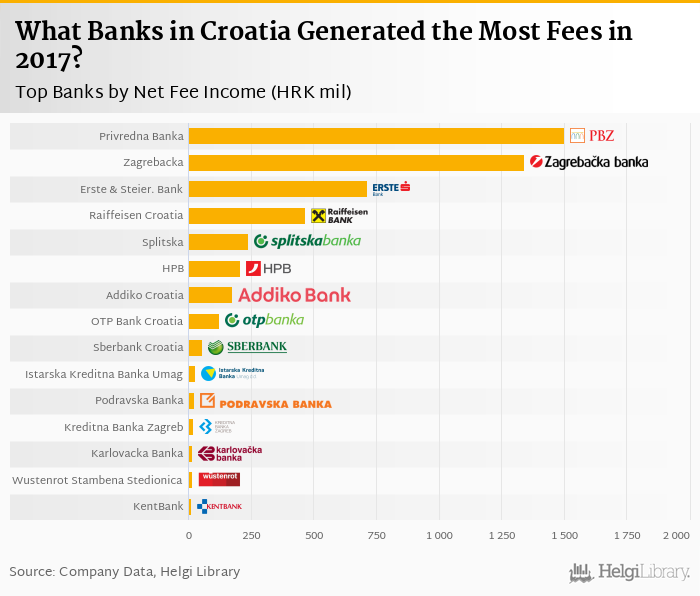 Based on a comparison of 23 banks in Croatia in 2017, Privredna Banka Zagreb generated the largest fee income, followed by Zagrebacka Banka and Erste & Steiermarkische Bank.