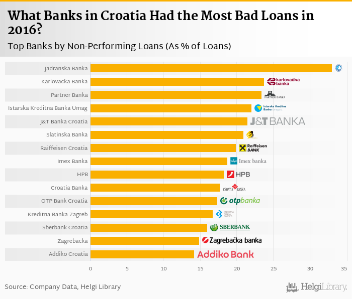Based on a comparison of 23 banks in Croatia in 2016, Jadranska Banka had the highest share of bad loans, followed by Karlovacka Banka and Partner Banka.