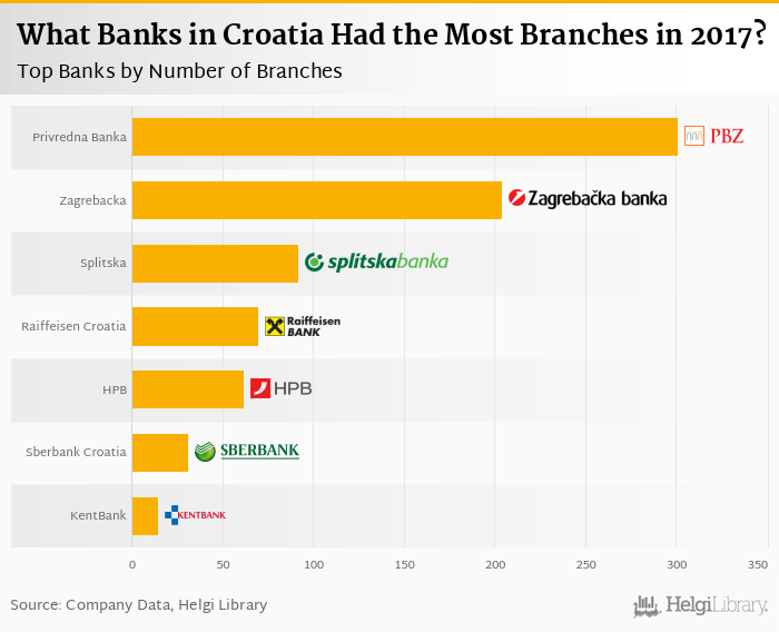 Comparing Privredna Banka Zagreb with its closest peers, Zagrebacka Banka operated a network of 204 branches in 2017, Splitska Banka had 92.0 branches and Raiffeisenbank Croatia had a network of 70.0 branches in 2017.