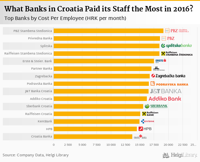 Based on a comparison of 23 banks in Croatia in 2016, PBZ Stambena Stedionica was paying its employees the best, followed by Privredna Banka Zagreb and Splitska Banka.