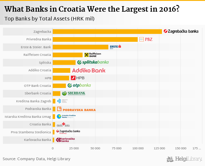 Based on a comparison of 27 banks in Croatia in 2016, Zagrebacka Banka was the largest bank by assets, followed by Privredna Banka Zagreb and Erste & Steiermarkische Bank.
