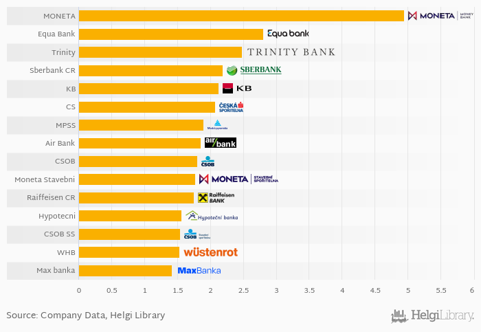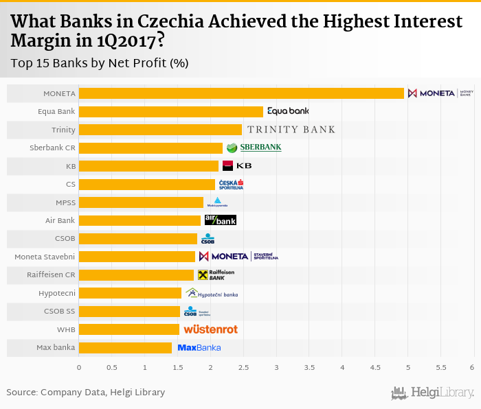 Based on a comparison of 21 banks in Czechia in 1Q2017, MONETA Money Bank operated with the highest net interest margin, followed by Equa Bank and Trinity Bank.
