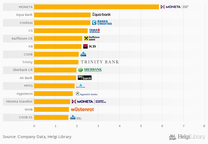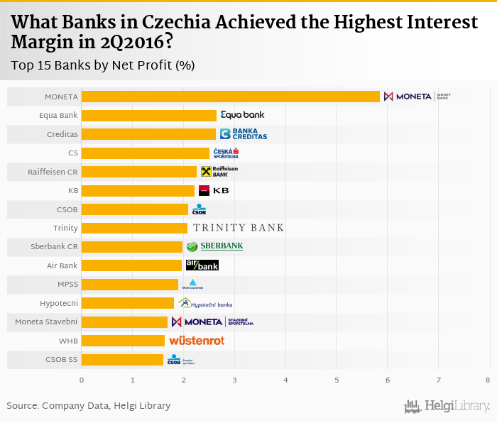 Based on a comparison of 21 banks in Czechia in 2Q2016, MONETA Money Bank operated with the highest net interest margin, followed by Equa Bank and Banka Creditas.