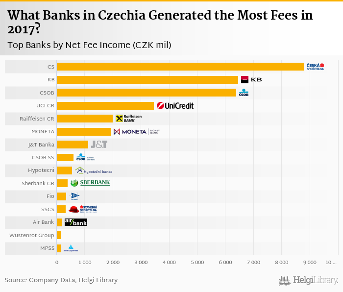Based on a comparison of 26 banks in Czechia in 2017, Ceska Sporitelna generated the largest fee income, followed by Komercni Banka and CSOB.