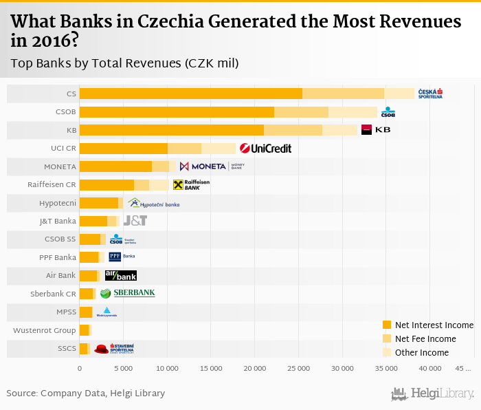 Based on a comparison of 26 banks in Czechia in 2016, Ceska Sporitelna generated the largest revenues, followed by CSOB and Komercni Banka.