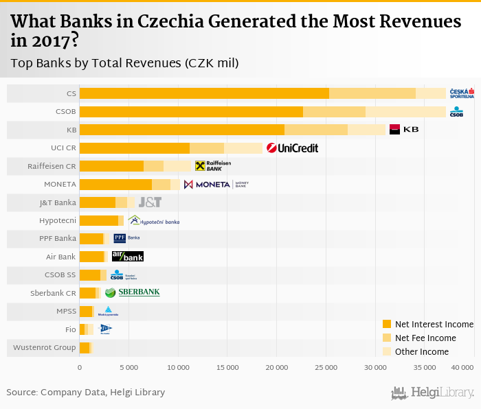 Based on a comparison of 26 banks in Czechia in 2017, Ceska Sporitelna generated the largest revenues, followed by CSOB and Komercni Banka.
