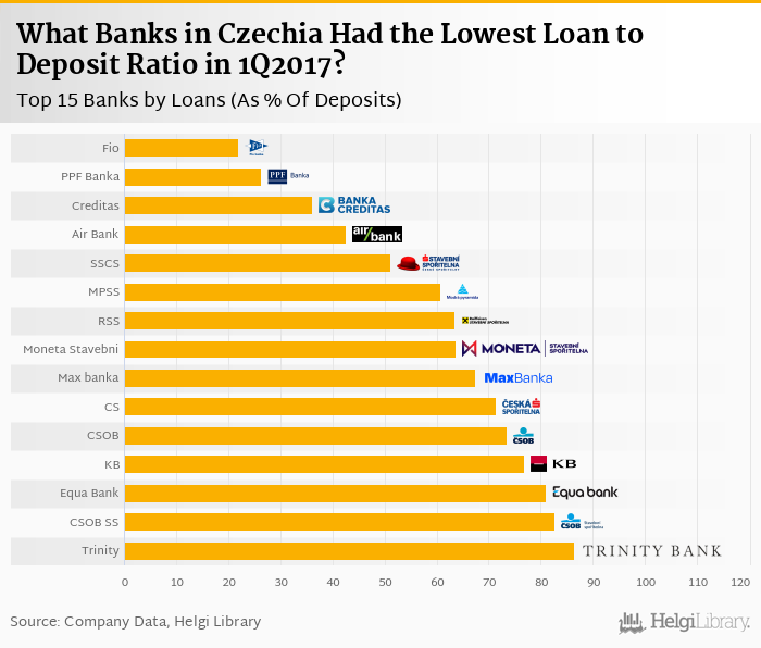 Based on a comparison of 20 banks in Czechia in 1Q2017, Fio banka operated with the lowest loan to deposit ratio, followed by PPF Banka and Banka Creditas.