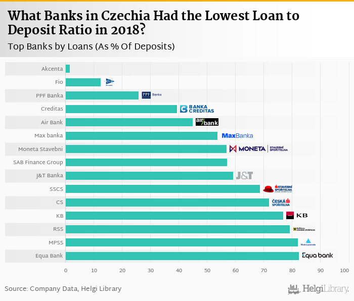 Based on a comparison of 25 banks in Czechia in 2018, Akcenta operated with the lowest loan to deposit ratio, followed by Fio banka and PPF Banka.
