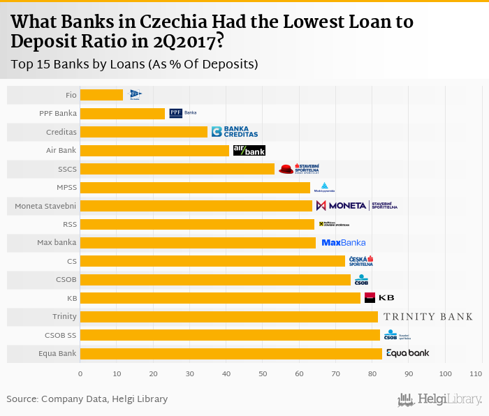 Based on a comparison of 20 banks in Czechia in 2Q2017, Fio banka operated with the lowest loan to deposit ratio, followed by PPF Banka and Banka Creditas.