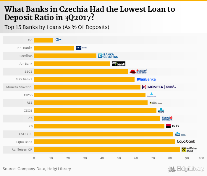 Based on a comparison of 20 banks in Czechia in 3Q2017, Fio banka operated with the lowest loan to deposit ratio, followed by PPF Banka and Banka Creditas.